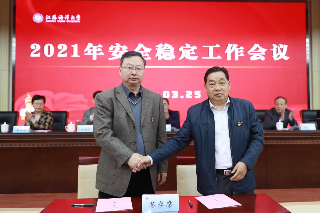 校长宁晓明代表学校与二级单位(部门)签订2021年安全稳定工作责任书,设备与实验室管理处处长刘玮炜、海洋技术与测绘学院院长焦明连,分别代表机关和教辅单位、学院上台签订责任书。