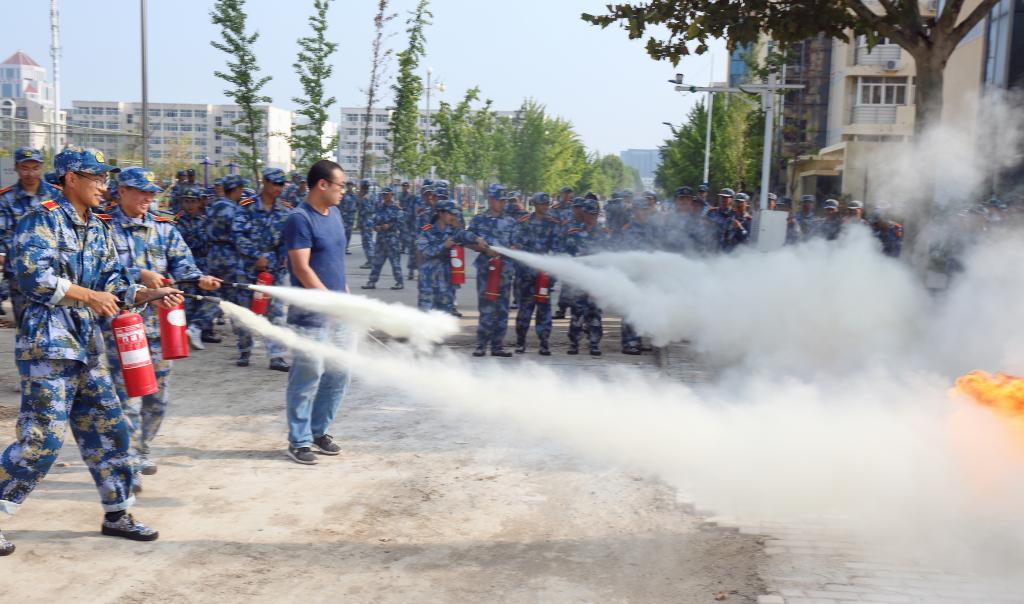 苍梧校区的灭火演练共分为三组,各组分别由教官带到指定场地集合。前两组由消防科的老师讲解灭火器的工作原理、使用方法以及注意事项,并指导学生使用灭火器进行灭火操作;第三组由消防支队教官亲自讲解和指导灭火器和水带的使用。