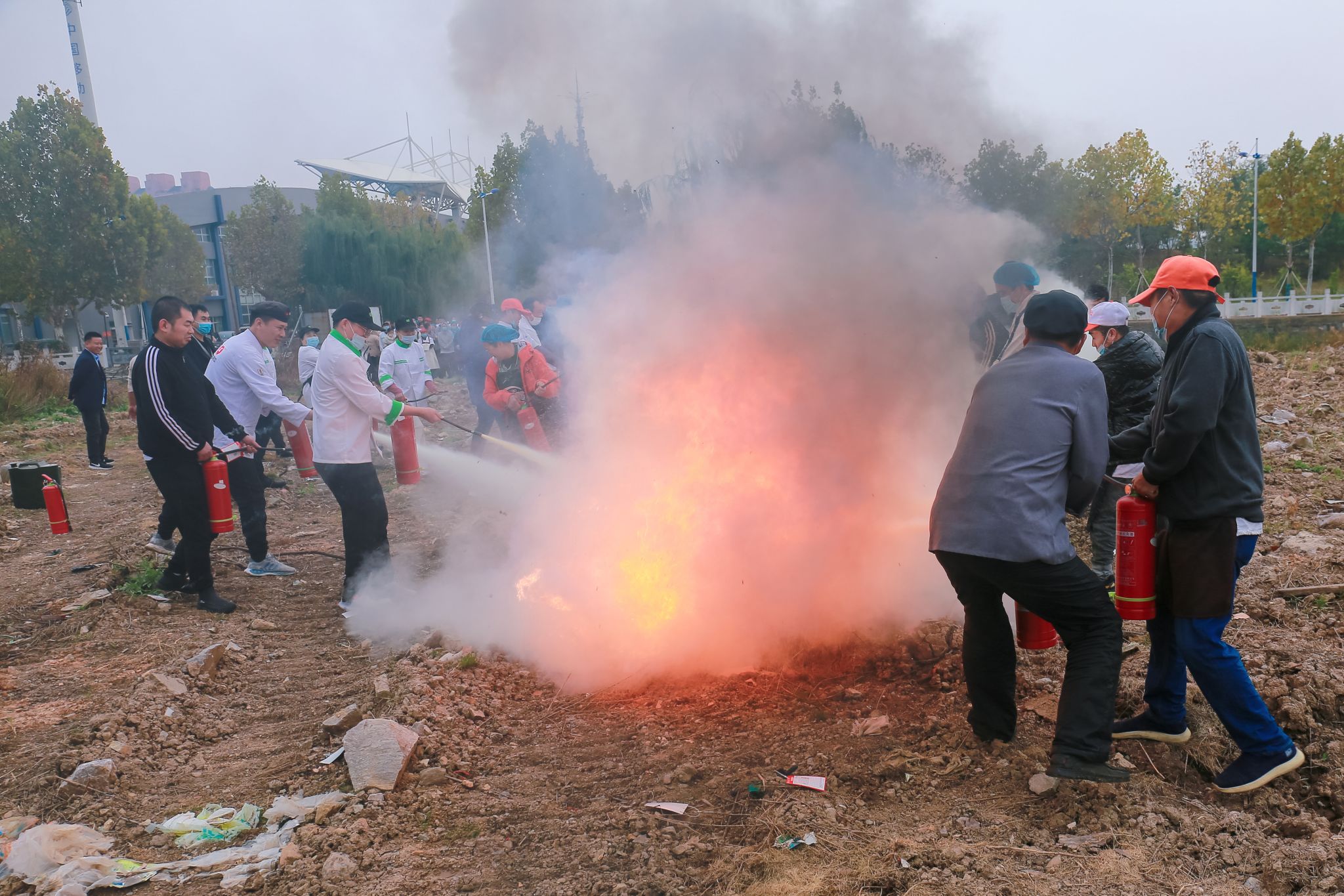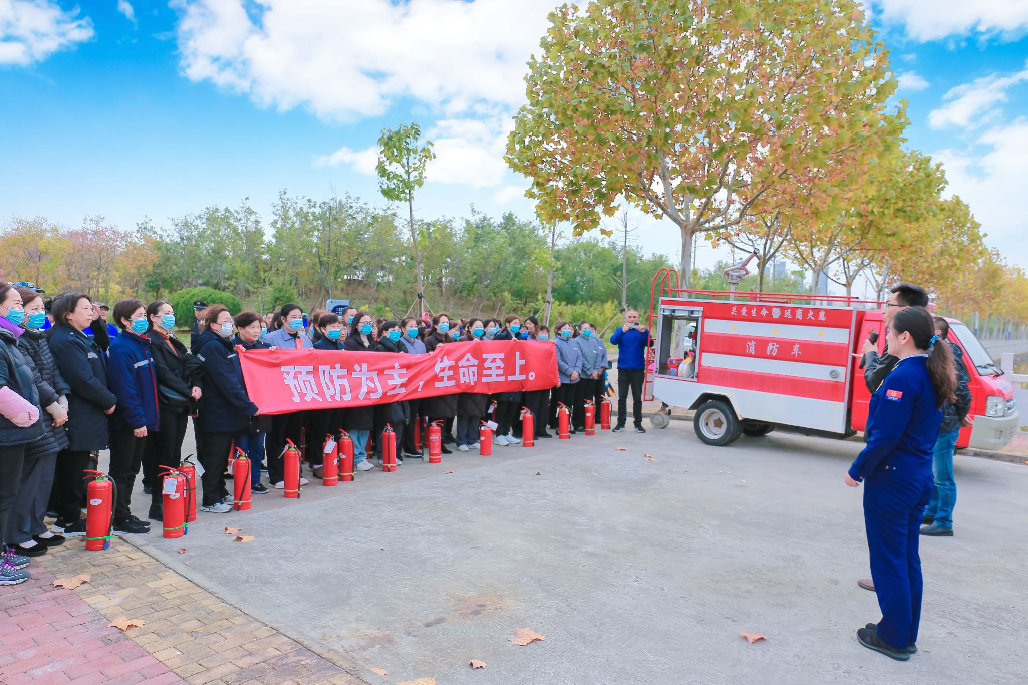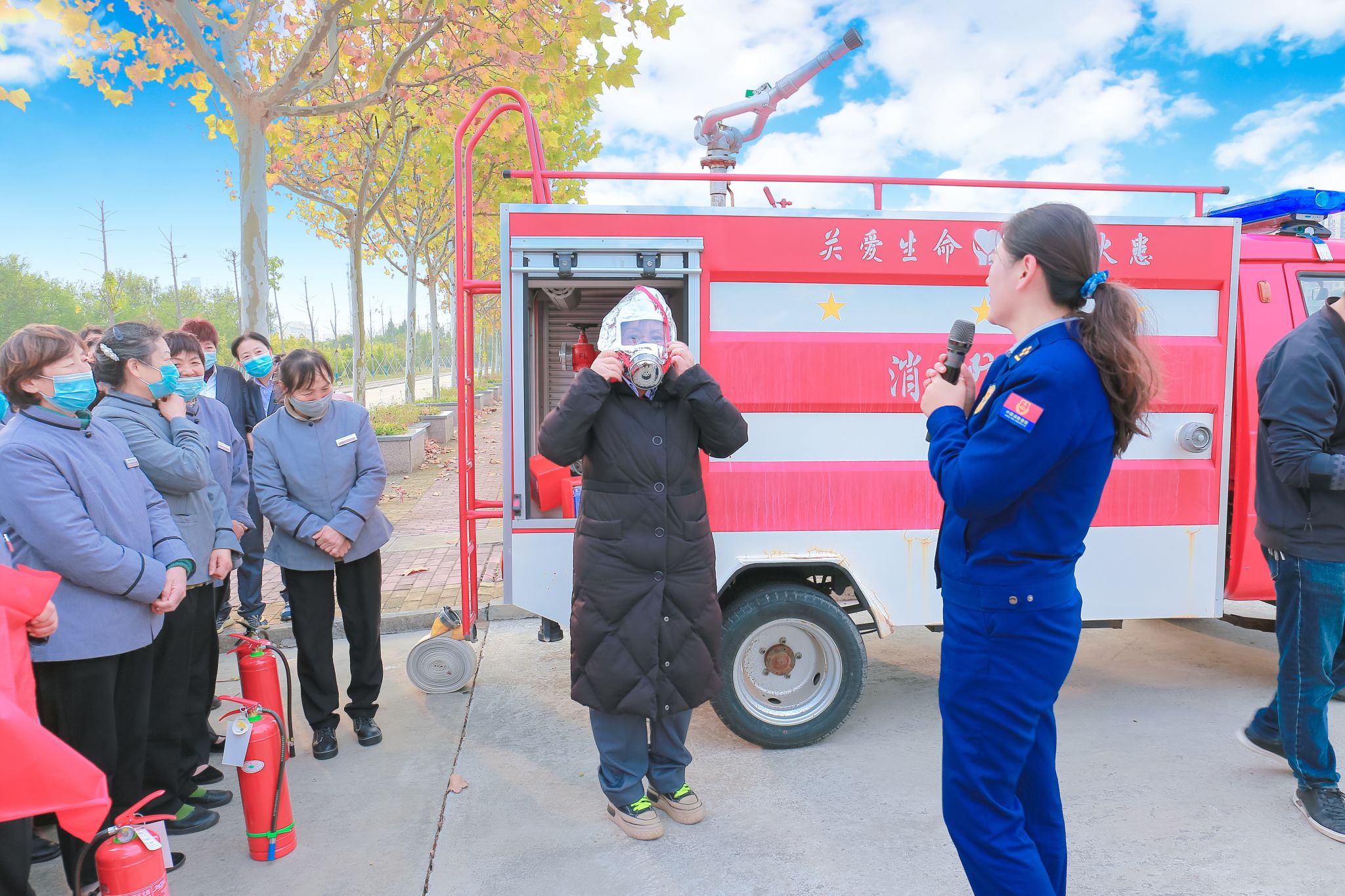 刘函如现场讲解和示范灭火器、防毒面具、消火栓等常见消防器材的使用方法、分解动作、注意事项,在场人员通过学习和灭火实操,了解了日常工作中身边消防器材的作用,提高了对消防安全的认识,掌握了应对初期火灾的能力。