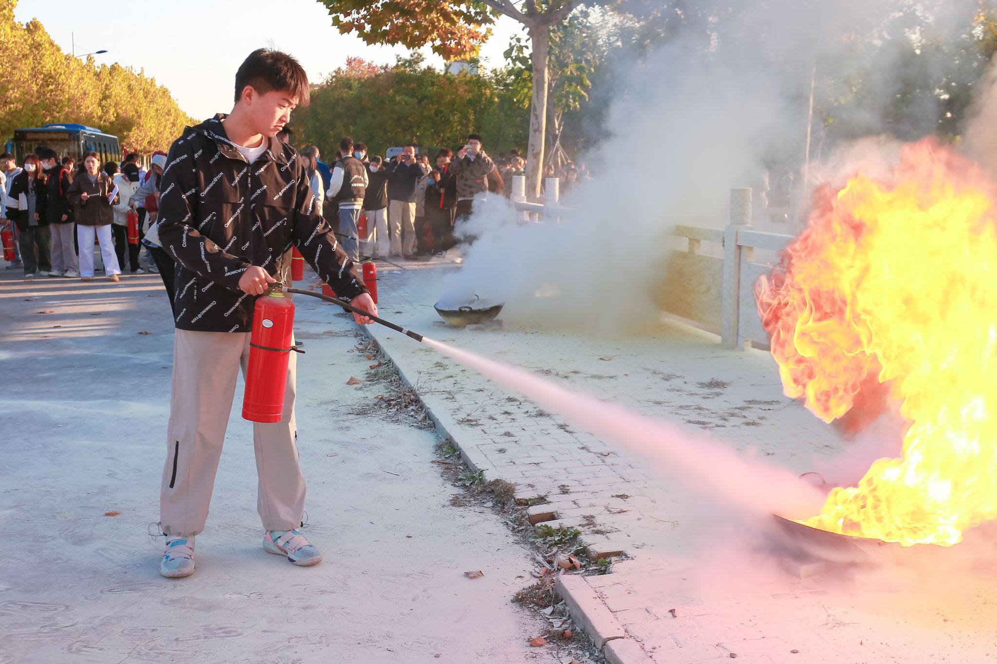 在刘科长的指导下,学生们分批上前,亲自体验了灭火器的操作。面对熊熊燃烧的火堆,他们沉着冷静,按照所学步骤迅速扑灭了火焰。