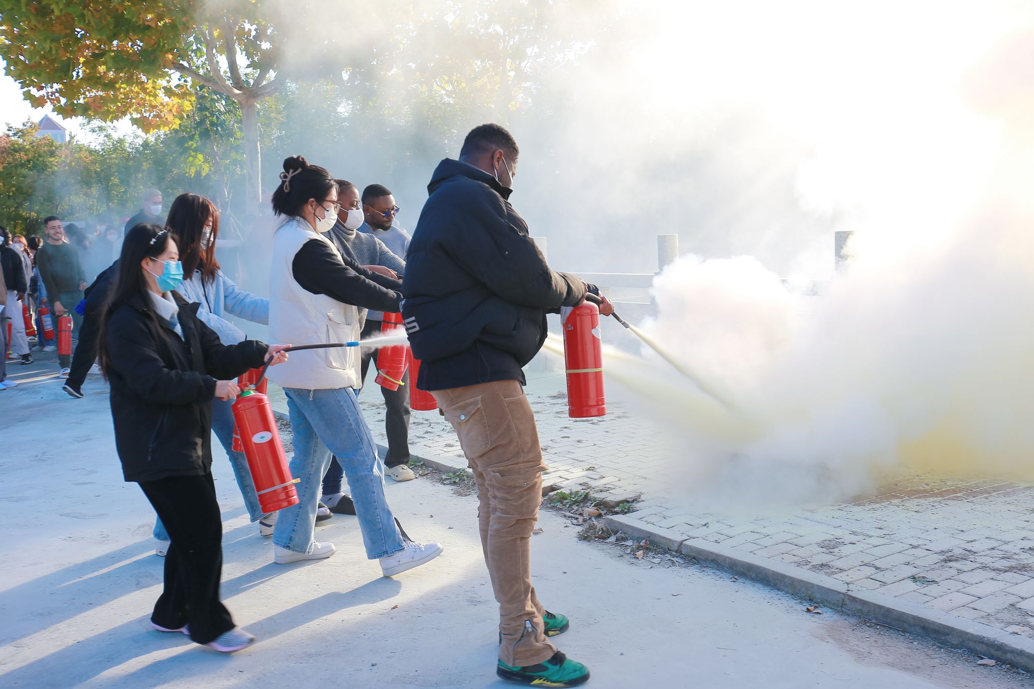 随后,在校园东北角,一场别开生面的灭火演练吸引了众多师生的目光。160名留学生和300名中国学生共同参与了这一实践环节。市消防救援支队刘函如科长亲临现场,她详细讲解了ABC型干粉灭火器的使用方法、操作步骤以及使用过程中的注意事项,强调了正确选用和操作灭火器对于初期火灾扑救的重要性。