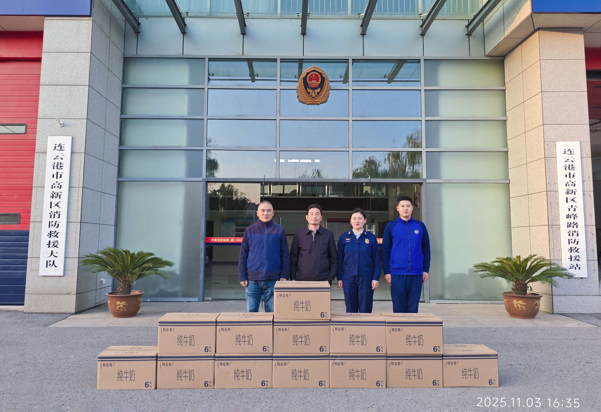 江苏海洋大学代表向长期奋战在灭火救援一线的消防指战员致以崇高敬意,并赠送牛奶等慰问物资,表达对消防战士们辛勤付出的诚挚关怀与支持。