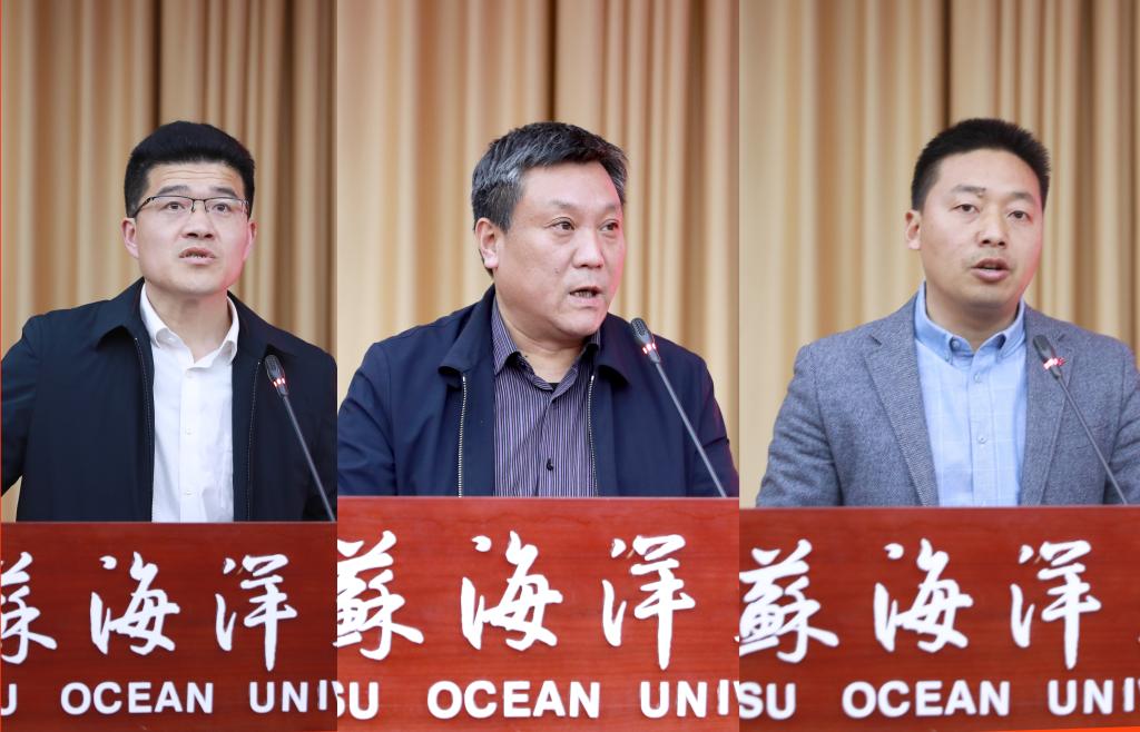 校长宁晓明代表学校与二级单位(部门)签订2021年安全稳定工作责任书,设备与实验室管理处处长刘玮炜、海洋技术与测绘学院院长焦明连,分别代表机关和教辅单位、学院上台签订责任书。