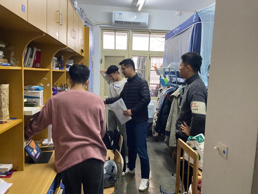 此次检查分29个小组,覆盖苍梧校区29栋公寓楼、3646间宿舍。检查小组认真排查学生宿舍存在的安全隐患,在整体推进、拉网式全覆盖基础上,聚焦排查大功率及违禁电器的使用、私拉乱接电线、插排随意摆放等,并认真记录检查情况。检查过程中,检查组人员不时提醒学生们增强宿舍用电、用水、防火、防盗等方面的安全意识;提醒大家坚持戴口罩、勤洗手、宿舍常通风,持续做好个人防护。检查发现,学生宿舍整体状况良好,绝大多数宿舍布置温馨,物品摆放整齐,地面干净卫生;部分宿舍物品摆放凌乱,人离开时充电宝等用电器连接插排未断电,阳台堆放纸壳等易燃物等。