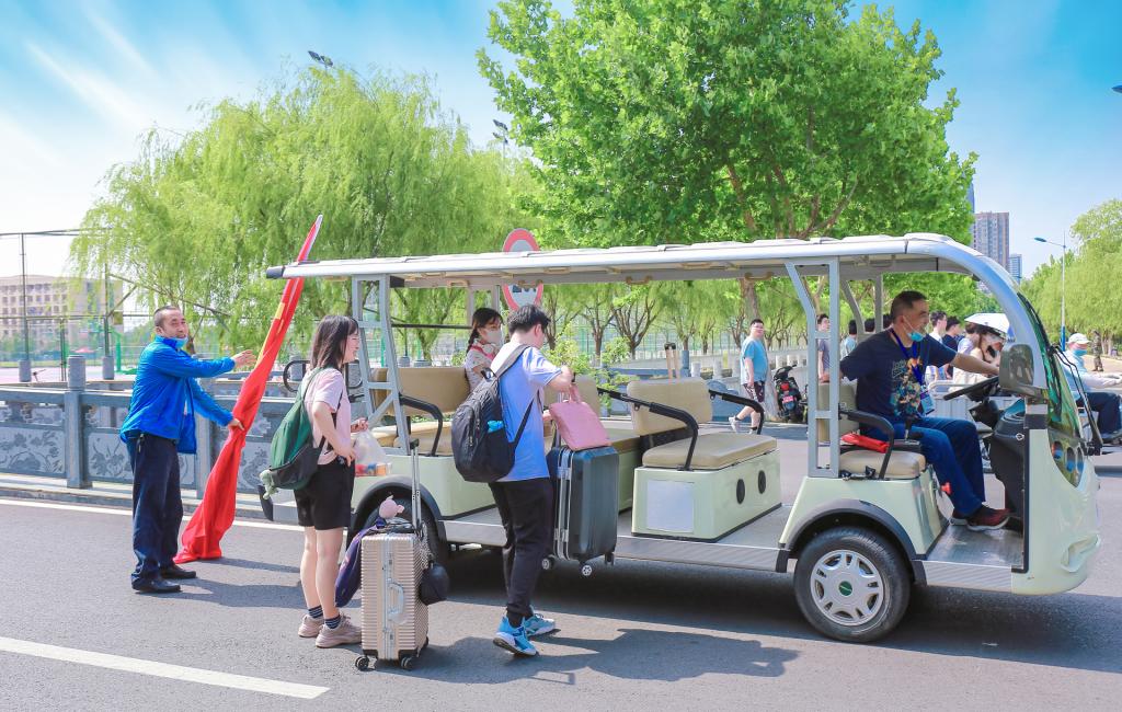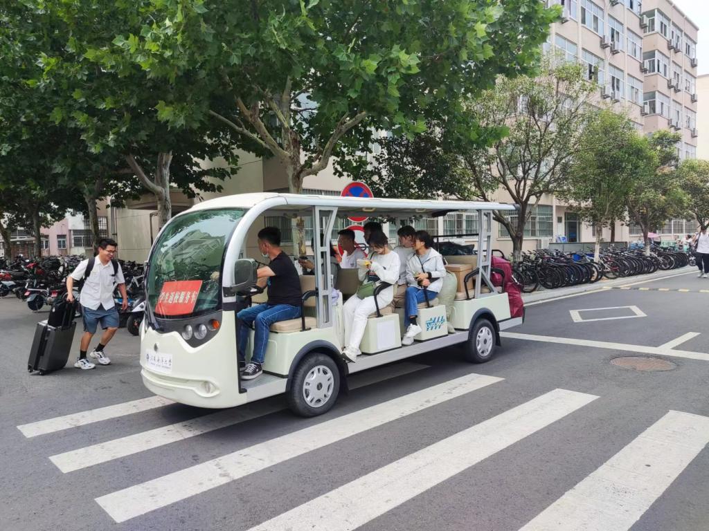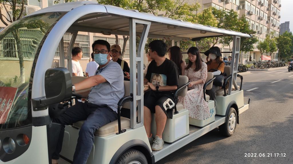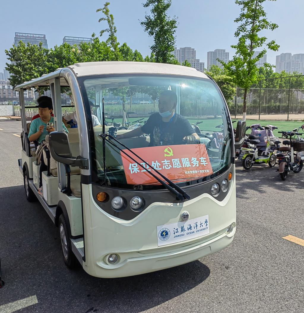党课结束后,全体党员佩戴着党徽和入党积极分子一起,按照事先拟定的值班表安排,不畏酷暑、不惧风雨、不辞辛劳,驾驶行李车不间断的往返于学生生活区和3号门,帮助学生运送行李,引导学生安全、文明、有序离校。