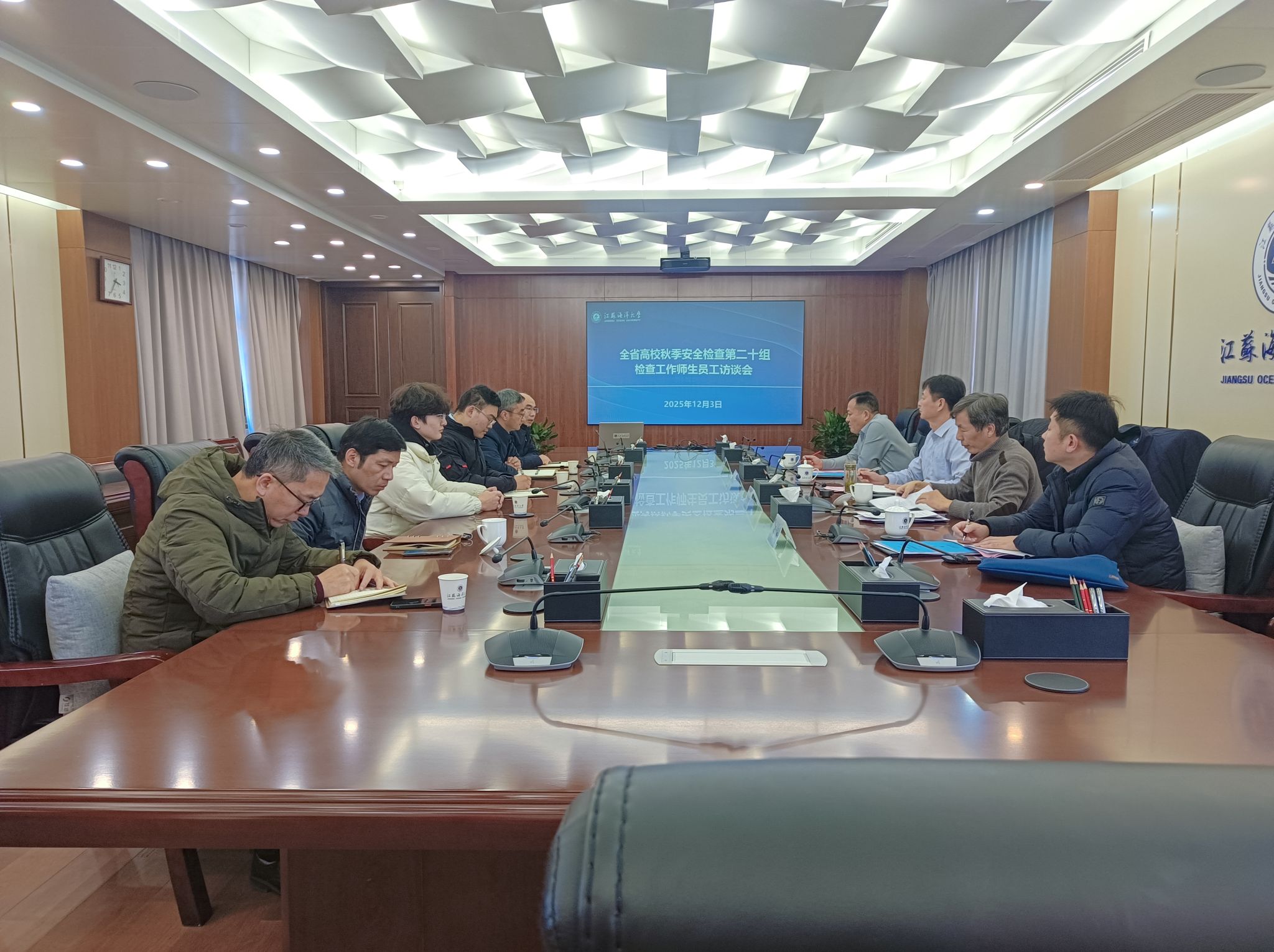洪宇介绍检查工作安排,各校依次汇报自查情况。专家组查看了我校安全工作台账后召开了师生员工访谈会,了解我校安全管理措施执行情况,广泛听取了师生员工的意见建议。下午,专家组实地检查了我校食堂、宿舍、实验室、危化品库房、在建工地、配电房、监控消控中心、快递外卖点等安全重点场所。实地检查结束后,检查组在行政楼二楼会议室召开问题反馈会并下达整改通知书,党委常委、副校长郑利军出席会议。