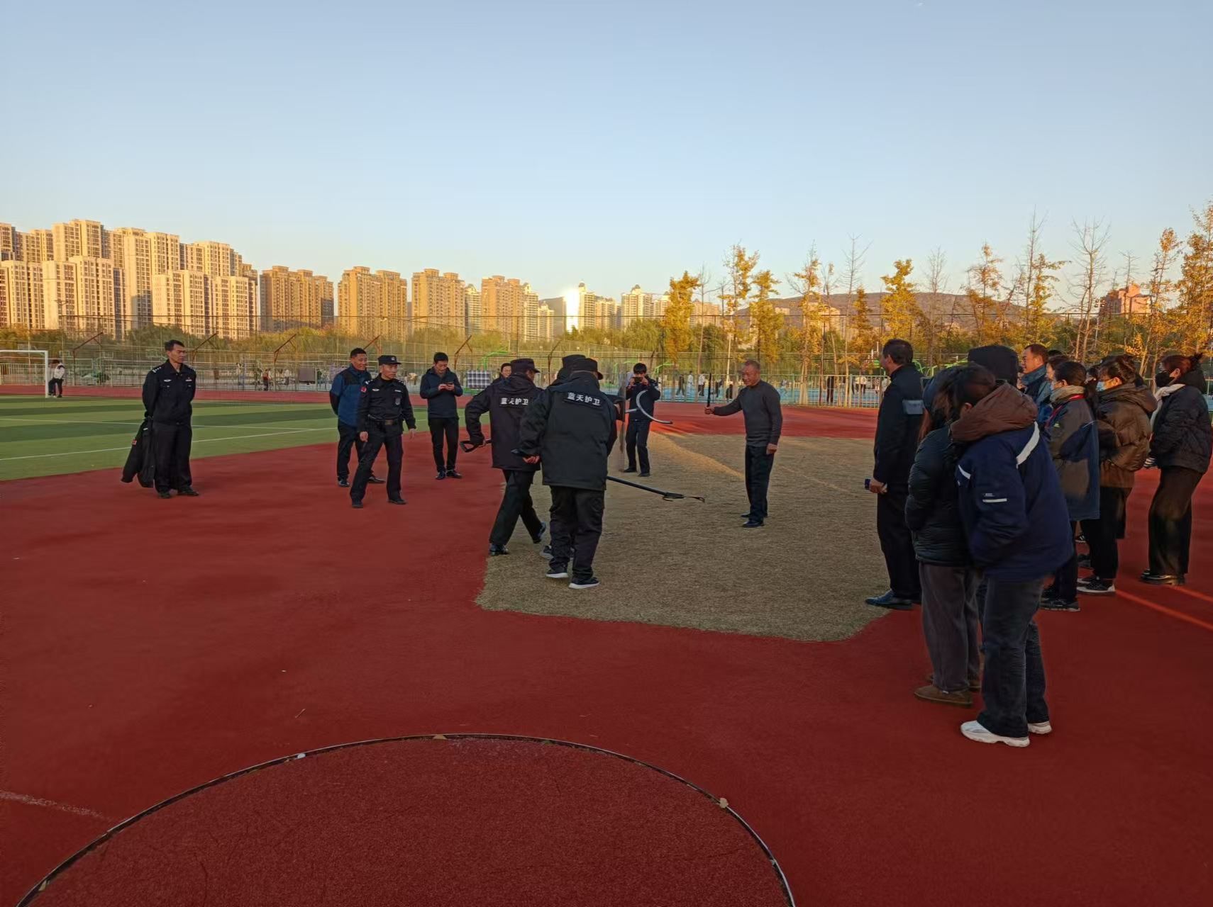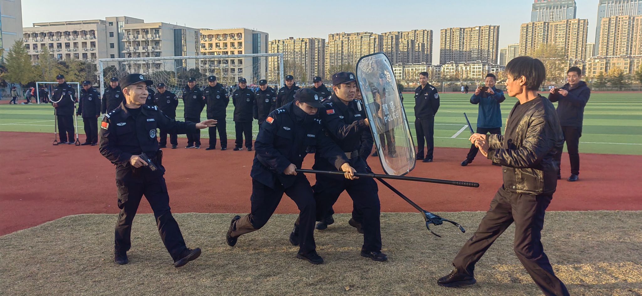 为全力防范各类突发事件,确保发生紧急事件,能迅速反应、有效处置,11月27日下午,保卫处联合学生处邀请高新分局巡特警大队吴永先警官在西运动场对保安、物业人员进行防暴演练。保卫处、学生处相关负责人,驻校民警参加了本次演练。