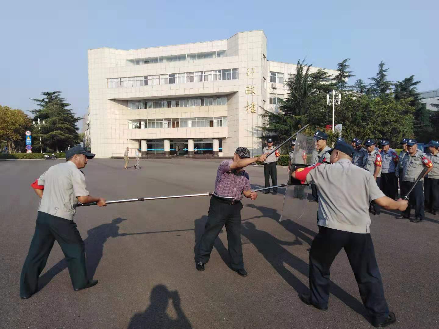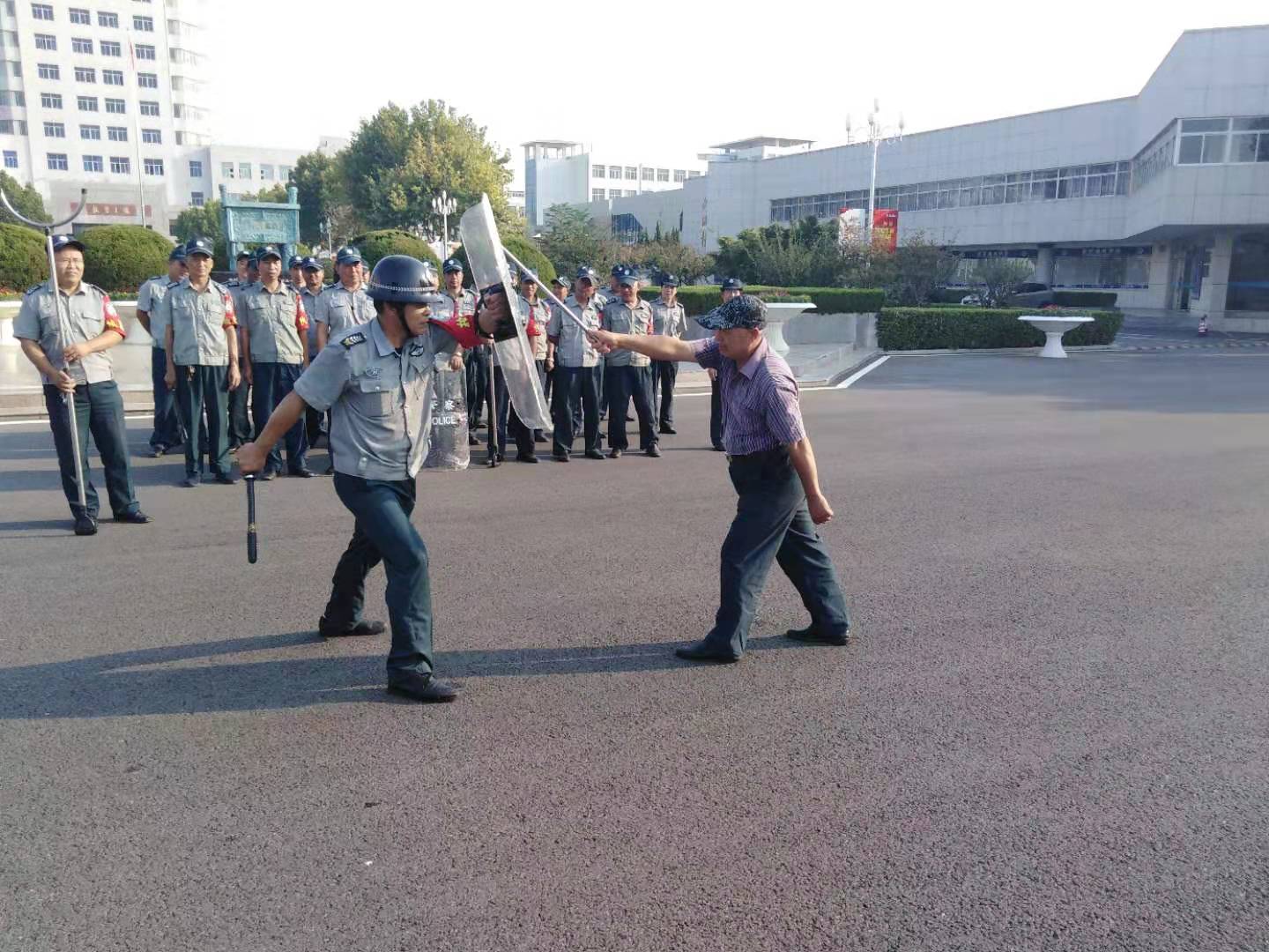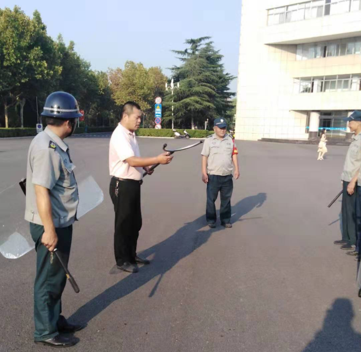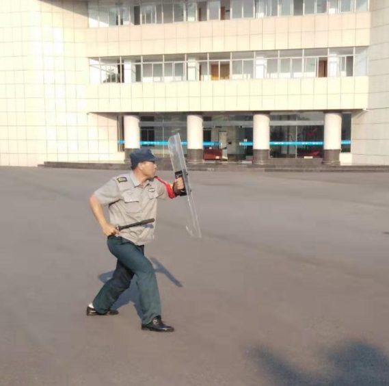当前,随着国际形势的重大变化、在中华人民共和国成立70周年即将到来之际,结合我校实际情况,保卫处于2019年9月5日上午,在行政楼广场举行了反恐处突演练,以提高安保人员对突发事件的处置能力、各班组负责人的协调配合能力及一线安保队员的应变能力。本次演练前期,保卫处安排专业人士对警用器材使用、警棍术、防暴盾等培训。